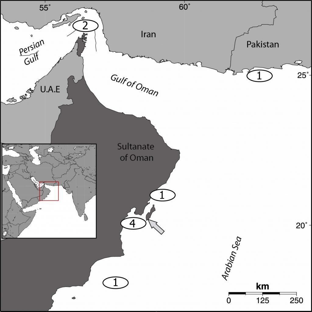 Figure 1. End locations of the only nine olive ridley turtles tracked after nesting on Masirah Island. Arrow indicates tagging site at the south of Masirah Island. Numbers indicate how many turtles used the location as a foraging area. Base map made in MapTool, a free map creation tool from seaturtle.org.