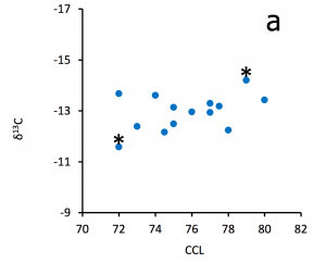Mean CCL for all data was 75.7cm (75.8cm after removal of 2 suspect data points), range 72.0 to 80.0cm. Corresponding data for δ13C were mean -12.95‰, range -11.58 to -14.20‰ and for δ15N, mean 16.38‰, range 13.52 to 19.22‰. No clear pattern of size partitioning based on CCL was discernible plotting δ13C against δ15N signatures (Figure 3). One sample was a visual outlier, exhibiting both lowest δ13C and highest δ15N values.