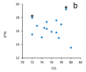 There was no significant correlation between δ13C and CCL (Spearman Rank Correlation, rs = -0.295, p = 0.31; Figure 4a). Likewise, there was no significant correlation between δ15N and CCL even after removal of the two suspect data points (Spearman Rank Correlation, rs = -0.116, p = 0.72; Figure 4b).