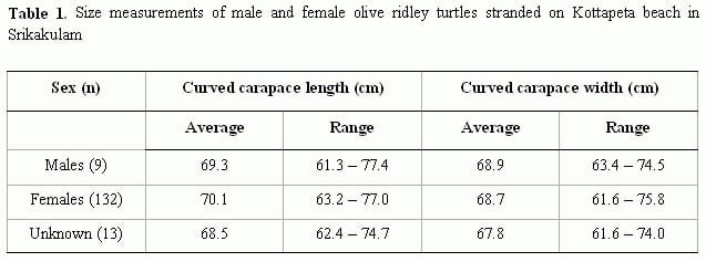 A team comprising Forest Department officials, local wildlife conservation NGOs and volunteers visited the spot and examined the carcasses. All the dead turtles were adults. The beached turtles were sexed using external characteristics. Of the dead turtles that were sexed, 86% were females, 6% were males and 8% were unidentified carcasses. Curved carapace length (CCL) and curved carapace width (CCW) were measured for all dead turtles.